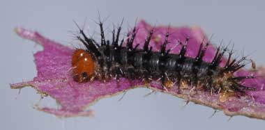 (参考) 少し成長したイワサキタテハモドキの幼虫(1齢、2.0mm、シソモドキ) 2017年7月27日 撮影 静岡市駿河区 飼育 沖縄県石垣島産母蝶採卵 個体1:孵化当日ですが、こちらは夜に撮影したものです。糞も見え順調に育っています。しかし翌日死亡しました。 トップページへ |