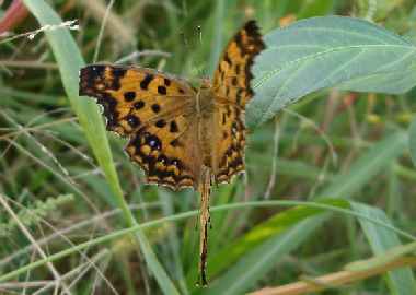 | キタテハは珍しいというほどの蝶ではないかもしれませんが、大阪市内ではほとんど見られなくなりました。食草のカナムグラは全草にトゲがあり、嫌われ者でほとんど刈られて無いからかもしれません。私は河川敷でしか見たことがありません。大和川や淀川(東淀川区)、尼崎市の藻川ではカナムグラも茂り、キタテハも多いです。都会では河川敷の蝶と言えるでしょう。秋から春まで見られる秋型は、それ以外に見られる夏型に比べると、凹凸が大きく色もより赤っぽい感じです。裏面にはアルファベットの“c”のような模様があります。カナムグラさえ見つかれば、幼虫は巣を目当てに見つかりやすいです。 |