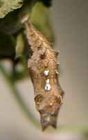2012年5月23日 静岡市駿河区大谷 前蛹になった翌日には蛹化しました。多くのタテハと同様に、輝く突起を持っています。5月29日に無事羽化しました。 トップページへ |