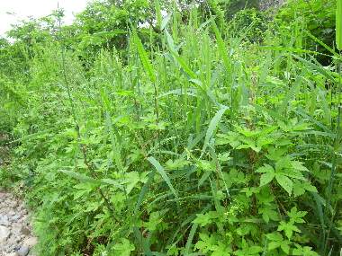 幼虫の巣と幼虫(3齢?)と環境 2003年10月1日 兵庫県尼崎市瓦宮 カナムグラの葉につくったキタテハの巣です。中に3齢幼虫がいます。ここは藻川の河川敷です。この写真では、向こう岸(東、左岸)の水際にカナムグラがあり、そこで下記のキタテハの幼虫が見つかりました。 トップページへ |