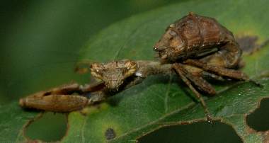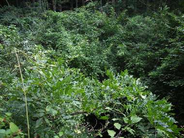 (参考) 幼虫の生息環境とフジにいたカマキリ 2005年8月12日 大阪府豊能町 幼虫が見つかったフジが左下に見えます。右下は川です。なお、小さなカマキリが同じフジにいたので併せて載せておきます。産卵に来たコミスジが捕まる可能性が高いです。 トップページへ |