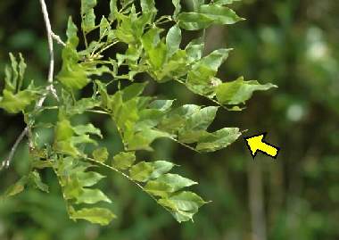 2005年6月13日 大阪府高槻市三好山 成虫は、山地ではよく見かけますが、その卵や幼虫はまだ見たことがありません。おそらくこれは、フジの葉に作られたコミスジの1齢幼虫の造形物と思われますが、残念ながら、天敵にやられたのか幼虫は見つからず、確認できませんでした。 トップページへ |