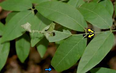 (参考) 幼虫(3齢?、5mm、フジ) 2005年8月12日 大阪府豊能町 上の写真と同じフジで見つかった少し成長した幼虫(黄色矢印)です。オレンジ色の矢印は筋状に付けた食べ跡です。なお、拡大写真は、家に持ち帰ってから撮影したものです。 トップページへ |
