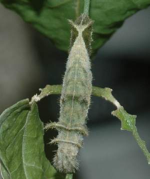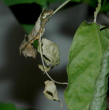 (参考) 幼虫(5齢、フジ) 2005年8月24日 大阪府豊能郡産 大阪市淀川区飼育 個体2です。個体1では、しおれた葉の中にいることが多かったのですが、個体2では、外にいることが多いです。その違いが幼虫の色に影響を与えているのでしょうか。個体1では緑がかっていますが、個体2では褐色です。 トップページへ |