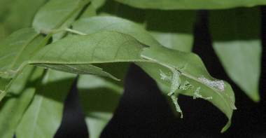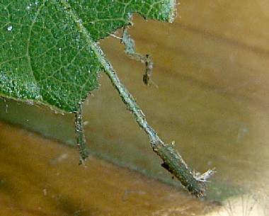 (参考) 幼虫(1齢、2mm、フジ) 2005年8月12日 大阪府豊能町 渓谷沿いに生えていたフジの葉に見つけることができました。葉先に造形物を作ります。なお、拡大写真は、家に持ち帰ってから撮影したものです。この幼虫は、その後死亡しました。 トップページへ |