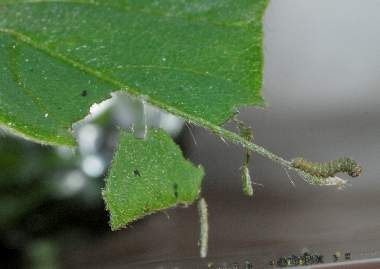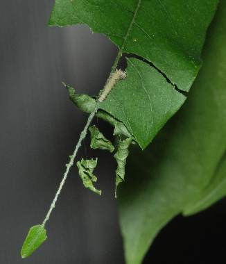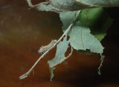 (参考) 幼虫の巣作り(1齢、クズ) 2007年9月 京都市北区 産 大阪市淀川区 飼育 葉を切り取り、糸でつないでモービルのような細工を作っています。 トップページへ |