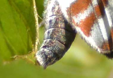 (参考) 前蛹 2005年8月26日 大阪府豊能郡産 大阪市淀川区飼育 個体1です。一番大きな幼虫がついに前蛹になりました。最初にいた1群の葉から隣に移ってそこで摂食もしていましたが、その一枚の葉裏です。色が少し変わってきました。 トップページへ |