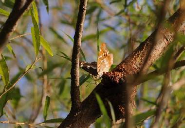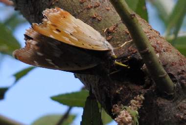 2009年7月26日 静岡市葵区 おそらく食樹となっているヤナギ類の樹液を吸汁しています。カミキリの出た跡でしょうか。このクロコムラサキは発生からかなり経っているようでかなり擦れています。通常型は新鮮なものも多くいたので、コムラサキ全体としてはだらだらと羽化しているのでしょう。この日は通常型は10匹程度見られましたが、クロコムラサキはこの1匹だけでした。 トップページへ |