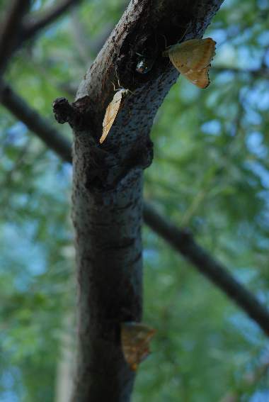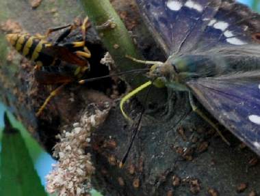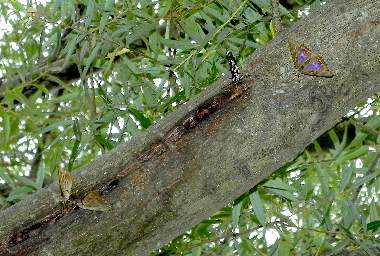 2009年7月26日 静岡市葵区 吸汁に集まっていたのは、カナブン、アシナガバチ類、シロテン?ハナムグリ、ゴマダラチョウ、コムラサキです。強さはこの順番で(ハナムグリは不明)、アシナガバチは蝶類を追い払っていましたが、蝶類はしぶとくハチの隙を見ては口吻を穴に差し込んでいました。 トップページへ |