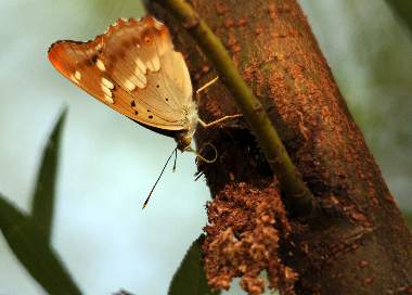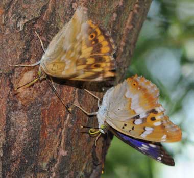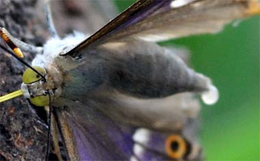 2009年8月9日 静岡市葵区 このコムラサキは、非常に長い間この場所にいて、ときおり翅を広げ、尾端を上げて放尿しました。放尿の瞬間は撮れませんでしたが、その直後、まだ一滴くっついているときの様子です。なお、放尿というのは生理学的には間違っているかもしれません。いったん吸収した水分ではないので。排液状便とでもいうべきか。 トップページへ |