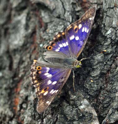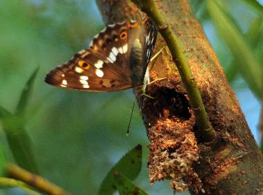 2009年8月9日 静岡市葵区 おそらく食樹となっているヤナギ類の樹液を吸汁しています。カミキリの出た跡でしょうか。このクロコムラサキは発生からかなり経っているようでかなり擦れています。通常型は新鮮なものも多くいたので、コムラサキ全体としてはだらだらと羽化しているのでしょう。下に示す7月26日と同じで、この日も通常型は10匹程度見られましたが、クロコムラサキはこの1匹だけでした。しかし目の前で吸汁してくれたので、十分に紫の幻光を楽しむことができました。 トップページへ |