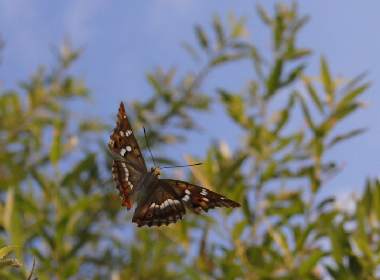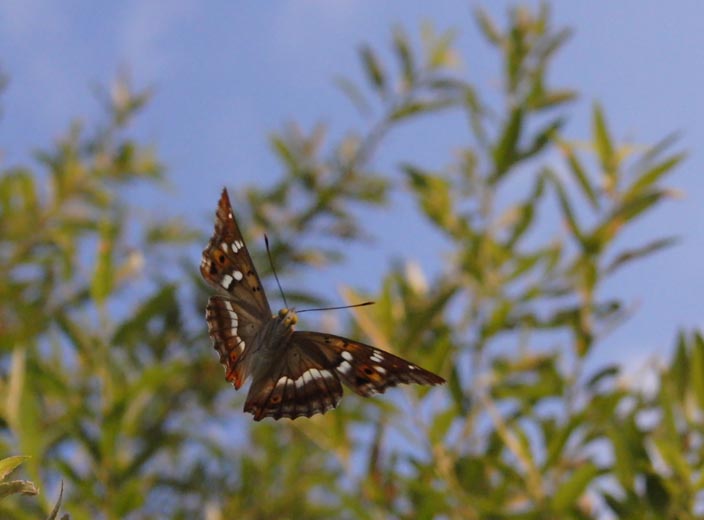 2009年5月10日15:10 静岡市葵区 樹高10m近い大きなヤナギ類で数匹のコムラサキが占有行動をとっていました。その中に1匹だけクロコムラサキがいました。 トップページへ |
