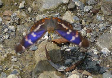 2015年9月5日 静岡市葵区 上と同じ場所です。やっと今年も吸水の場面に遭遇できましたが、残念ながら翅を開いた写真が撮れませんでした。たまたま飛び立って紫色を写すことができたのですが、ピントが合っていません。 トップページへ |