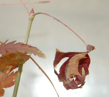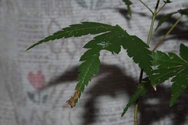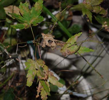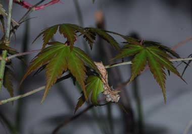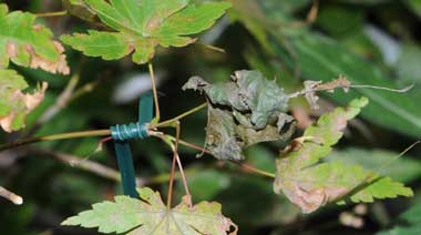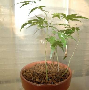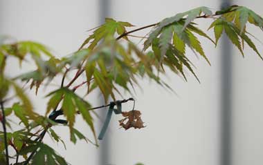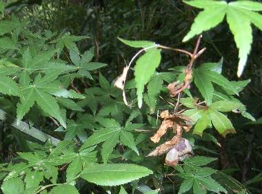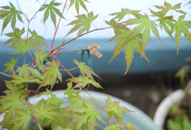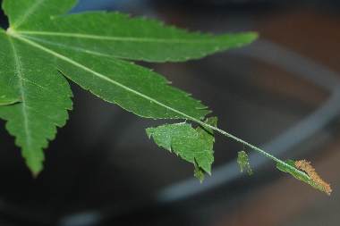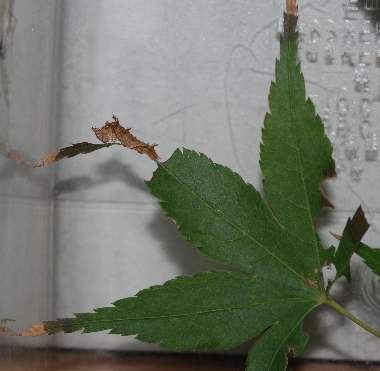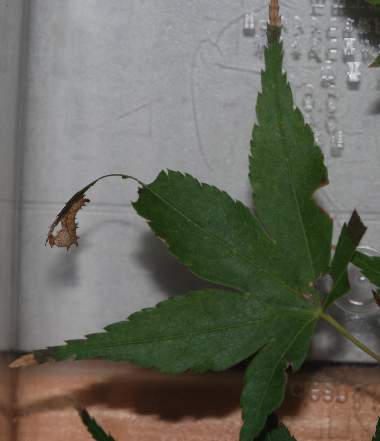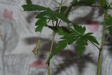 (参考) 幼虫(4齢、11mm、モミジ) 2007年9月18-30日 東大阪市枚岡公園 産 大阪市淀川区 飼育 切り枝では越冬まで持って行けないので、小さなモミジの苗木を鉢植えにして9月17日夜に幼虫を載せた後の様子です。3齢の時と同様に、一つの葉先に固執はしていますが、3齢のときに比べると、台座の葉を食べることに集中はしていません。 トップページへ |