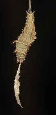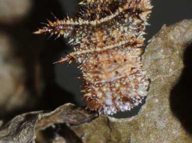 (参考) 越冬後脱皮したミスジチョウの幼虫(5齢?、12.5mm、モミジ) 2016年3月16日 撮影 長野県 産 静岡市駿河区 飼育 いつの間にか脱皮したようです。明らかに突起が長く、模様も濃くなっています。ときおり20℃を超える日があります。幼虫が棲む枯葉をくくりつけているモミジの芽はまだ固いのですが、もう一本ありこちらの芽はかなり膨らんでいます。おそらくすでにかじっているのでしょう。越冬時に比べて体長が大きくなっています。 トップページへ |