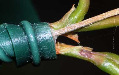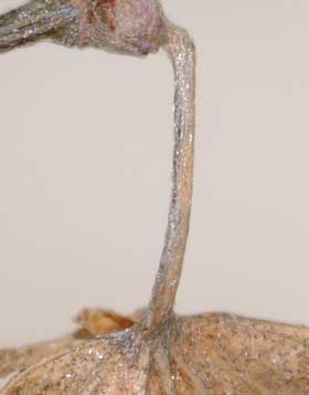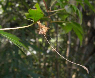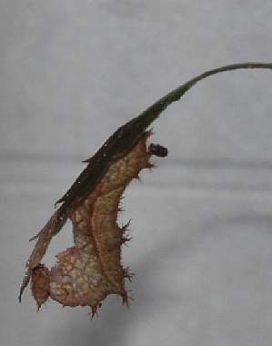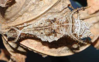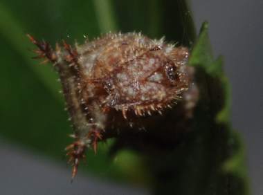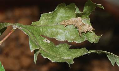 (参考) 幼虫の造形物作り(2齢) 2008年6月26日 大阪市淀川区 飼育 大阪府東大阪市(生駒山系)産 葉が萎れてきたので新しい葉に移したところ、やはり最初は造形物を作り、それ以外の時は先端の表側で静止しています。しかしその後この造形物は全て落下しました。さらにその後、飼育を外で行なっていたところ、残念ながら、クモかアリにやられていなくなりました。残念。 トップページへ |