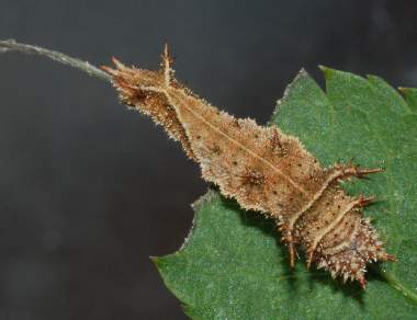 (参考) 幼虫(3齢?、10mm、モミジ) 2008年8月10日 大阪府東大阪市(生駒山系) しばらくして見に行くと、2匹のうち1匹だけ残っていました。 トップページへ |