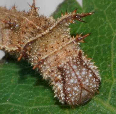 (参考) 幼虫(4齢、10mm、モミジ) 2007年9月14日 東大阪市枚岡公園 産 大阪市淀川区 飼育 脱皮後の幼虫のアップです。頭が大きくなった以外にはあまり変化がありません。 トップページへ |