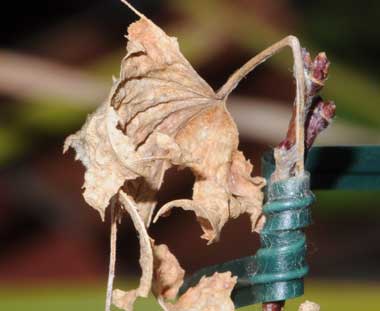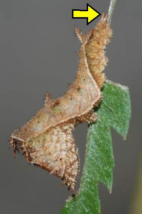 (参考) 幼虫(5齢?、モミジ) 2007年11月22日 東大阪市枚岡公園 産 大阪市淀川区 飼育 寒くなったとはいえ、葉が急に色づいてきたので驚きました。葉の中央部にしっかりと糸が張ってあります。また、やはりよく見ると、黄色矢印の位置が下写真のようにぐるりとかじられていました。青矢印の葉柄の付け根にも少ないですが糸を張っています。幼虫自身も少し暗めの色になったようにも思えますが、間違っているかもしれません。 トップページへ |