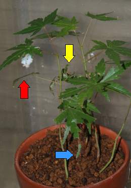 (参考) 幼虫の越冬台座(4齢?、モミジ) 2007年10月11日 東大阪市枚岡公園 産 大阪市淀川区 飼育 最近少し冷え込んで、朝方は20℃を切りました。この日の最低気温は気象庁の記録では大阪市で16.9℃となっています。そのせいか、ミスジチョウは、いつもいる葉(青矢印)や食べている葉(赤矢印)から、黄色矢印の位置に移りました。この葉の葉柄にはぐるっと噛み傷を付け、葉を萎らせています。まだ、葉柄の付け根に糸を吐いて補強はしていません。こういう行動をいつするのかが一番気になっていたので、飼っていた甲斐がありました。 トップページへ |
