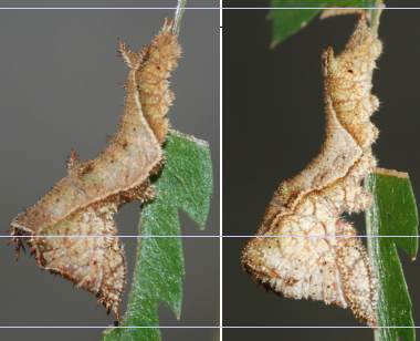 (参考) 幼虫(3齢から4齢?、11.5mm、モミジ) 2007年9月10〜15日 東大阪市枚岡公園 産 大阪市淀川区 飼育 持ち帰った日に、庭のモミジの切り枝に幼虫を移し、その後の台座作りの様子です。6日目に脱皮しておそらく4齢になりました。 トップページへ |