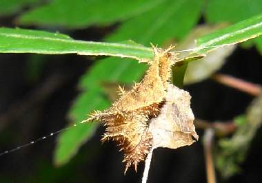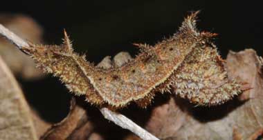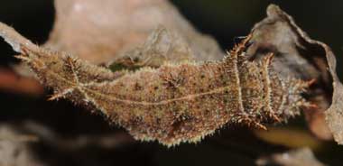 (参考) 幼虫(3齢?、10mm、モミジ) 2007年9月9日 大阪府東大阪市枚岡公園 枚岡公園に隣接する山地内の小さなモミジに枯葉とともにいました。 トップページへ |