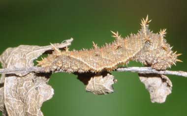 (参考) 幼虫(2齢) 2008年6月21日 大阪市淀川区 飼育 大阪府東大阪市(生駒山系)産 無事脱皮して2齢になりました。やはり葉の先端の表側にいます。 トップページへ |