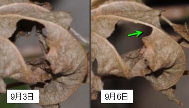![]() ↑ちょっと見ただけではどこに幼虫がいるのかわかりません。 ![]() ↑緑矢印で示す部分がなくなっています。 ![]() |