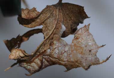 (参考) 幼虫(5齢?、モミジ) 2007年11月18日 東大阪市枚岡公園 産 大阪市淀川区 飼育 飼育に用いているモミジは、実生の15cmほどのものを鉢に3本ほど植えています。寒くなっても幼虫は葉を少しずつ食べています。その結果、今までずっといた木の葉を台座にしていた葉を最後に食べ尽くしてしまい(枯らした枯葉以外)、隣の木に移ってきました。そこで糸を張って固定しているようです。 トップページへ |