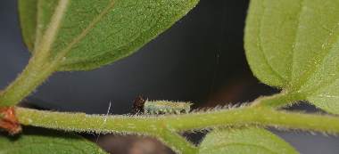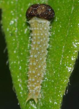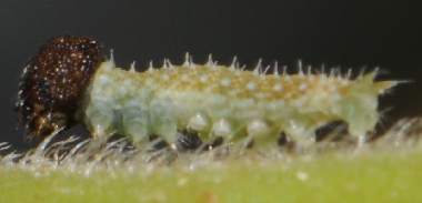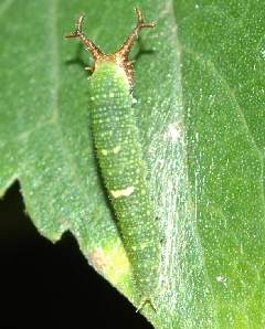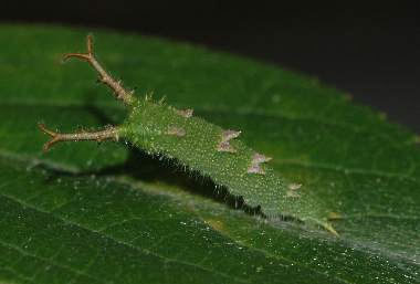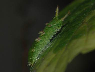 ゴマダラチョウの幼虫(2齢?) 2005年7月24日 大阪府豊中市服部緑地公園 参考までに、ほぼ同じ大きさ(12mm)のゴマダラチョウの幼虫を示します。背中にある突起物の数と色が異なります。 トップページへ |