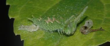 (参考) 幼虫(2齢、12mm) 2005年8月12日 大阪府豊能郡豊能町 能勢地方のオオムラサキもかなり数が減ってきたといわれています。また、下記に示す越冬幼虫を採集する人も多く、幼虫も成虫も見る機会が減ってきました。しかしながら、この時期では、まだ天敵や人に捕まってしまった幼虫もそれほど多くないので、食痕さえ見つかれば、比較的簡単に幼虫を見つけることができるようです。なお2枚の写真で個体は異なります(同じエノキ)。 トップページへ |