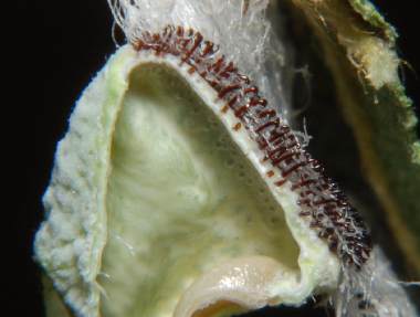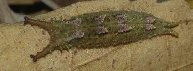(参考) 成長した幼虫(1齢、6.5mm) 2013年7月20日 山梨県北杜市長坂町 オオムラサキセンター 飼育 既に成長した1齢幼虫もいました。背面の突起も見えます。上半身を持ち上げて威嚇行動をとっているようにも見えます。 トップページへ |