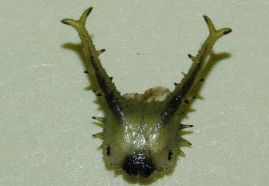 (参考) 脱皮後間もない幼虫(4齢) 2005年9月3日 大阪府豊能郡豊能町産 大阪市淀川区飼育 4齢は越冬します。頭部突起の形が3齢までのトゲトゲした感じが弱くなり、Y字部分が短くなります。ただ、この個体は左側がY字になっていません。 トップページへ |