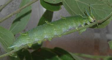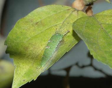 (参考) 少し色づいた幼虫(4齢) 2005年9月25日 大阪府豊能郡豊能町産 大阪市淀川区飼育 葉が少し黄色になってきました。それに合わせるように幼虫の体色も黄色みを帯びたようです。本来ならその後葉の下に潜るのでしょうが、残念ながら死亡してしまいました。 トップページへ |