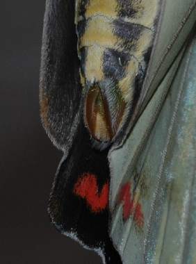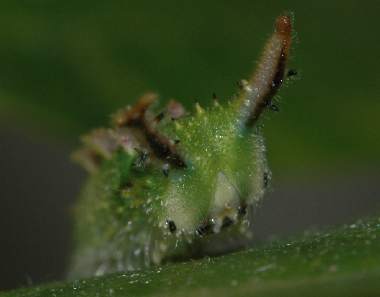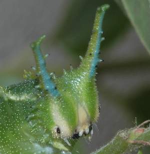 (参考) 幼虫(6齢、60mm) 2007年5月13日 大阪府豊能郡産 大阪市淀川区飼育 ここまでに示した個体とは異なる2007年の飼育結果です。突起部を拡大してみると、複雑な構造をしており、何かのセンサーになっていると考えています。 トップページへ |