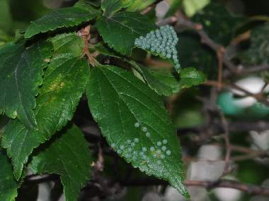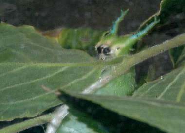 (参考) 散らばって静止した幼虫(1齢、3.7mm) 2013年7月20日 山梨県北杜市長坂町 オオムラサキセンター 飼育 孵化後の卵殻は10以上あったのですが、この写真には3匹だけ写っています。いずれも比較的若い葉の表面の葉先に、葉柄に向かって静止していました。 トップページへ |