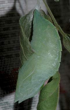 (参考) 糸で葉を固定する幼虫(6齢?、60mm) 2006年5月18日 大阪府豊能郡産 大阪市淀川区飼育 いよいよ蛹化の準備のために、葉柄を糸で固定しています。 トップページへ |