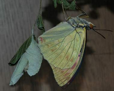 (参考) 蛹化途中のオオムラサキ 2006年5月20日 10:41am 大阪府豊能郡産 大阪市淀川区飼育 尾端部を皮から抜いた瞬間です。 蛹化過程の連続写真はこちらにあります。 トップページへ |