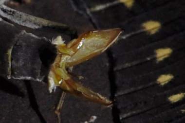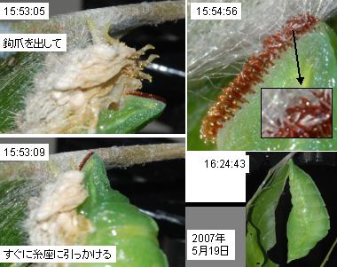 (参考) 蛹化 2007年5月19日、20日 大阪府豊能郡産 大阪市淀川区飼育 今年も、蛹化過程を観察できました。しかし前蛹のときに観察のためちょっと枝を動かしたので、前蛹はほんの少しの鉤爪でぶら下がる結果となり少し心配でしたが、落下することもなく蛹化しました。蛹化後も鉤爪の一部しか糸座にかかっておらず心配です。飼育箱が狭いために、良い蛹化場所が無かったためだろうと反省してます。この蛹からは♀が2007年6月2日に羽化しました。その前5月31日に♂が羽化しましたが、その蛹が羽化する過程の連続写真はこちらで紹介しています。 トップページへ |