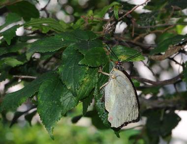 (参考) 産卵 2013年7月20日 山梨県北杜市長坂町 オオムラサキセンター 飼育 オオムラサキセンターの飼育施設「びばりうむ長坂」内のシーンです。卵を探していると、見学者が「産卵してる!」と声を上げ、撮影させてもらいました。生態図鑑によると、オオムラサキは葉表、葉裏、小枝に産むとあります。今日は5卵塊ほど卵を見つけましたが、葉表が多く、小枝の卵は見つかりませんでした。20年以上前に、自然状態の産卵シーンを見たことがあり、このときは小枝でしたが、卵には全く興味もなく、カメラもなかったので記録はありません。 トップページへ |