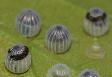(参考) 卵(孵化前の様子) 2013年7月20日 山梨県北杜市長坂町 オオムラサキセンター 飼育 同じ卵塊でも、発生の状況は少しずれるようです。既に孵化した卵殻も多かったのですが、黒くなった卵や、幼虫の頭部が見えている孵化直前の卵、既にハッチができた卵など様々ありました。 トップページへ |