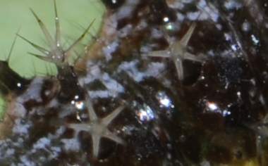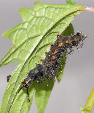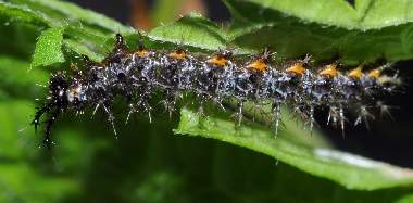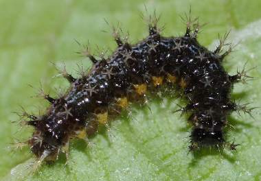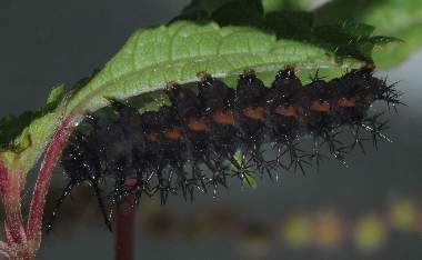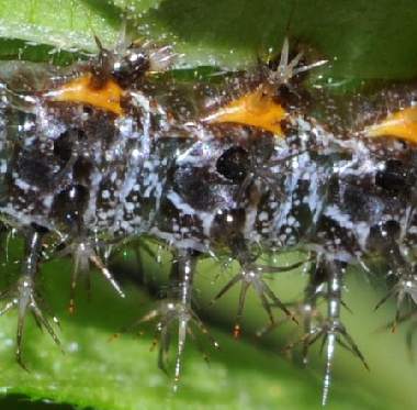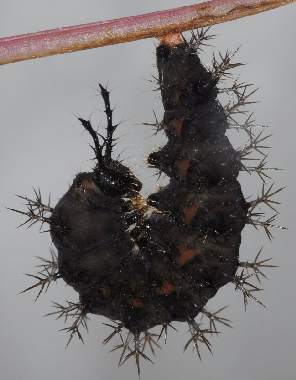 (参考) 幼虫(18mm、5齢、コアカソ)と棘 2010年9月13日 撮影 静岡市駿河区 飼育 宮崎県南那珂郡北郷町 産 この幼虫は、一見すると真っ黒の棘だらけですが、よく見ると赤色の線があります。黒くて突起のある頭部は、コノハチョウの幼虫に似てますね。 トップページへ |