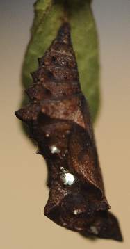 (参考) 羽化前兆を示すサカハチチョウの蛹 2010年9月20日夜撮影 静岡市駿河区 飼育 宮崎県南那珂郡北郷町 産 輝く突起はいつの間にか真っ黒になり、他の部分も黒くなりました。 トップページへ |