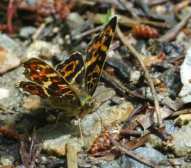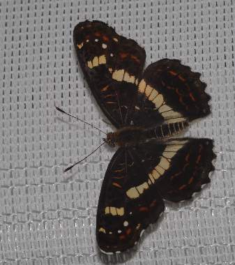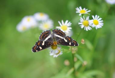(参考) 吸蜜(夏型、ヒヨドリバナ) 2004年7月31日 北海道旭川市 夏型の翅表は地色が黒く、白い帯でくっきりと逆さの八の字が見られます。 トップページへ |