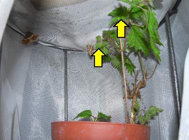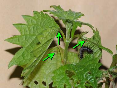 (参考) 幼虫の巣(コアカソ) 2011年5月29日 静岡市葵区中部 産 静岡市駿河区 飼育 ヒメアカタテハやアカタテハの幼虫は、カラムシなどの葉を閉じた巣を作りますが、幼虫も巣に近い隠れ家を作るようです。矢印で示すように、葉脈をかじって複数の葉を垂れさせてその内側に幼虫がいます。2010年に宮崎県で観察した自然下の幼虫も、写真をよく見ると葉を垂れさせていました。 トップページへ |