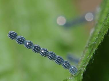 (参考) 強制採卵とサカハチチョウの卵 2011年5月16日 静岡市葵区中部 産 静岡市駿河区 飼育 これまで何度もうまく採卵できている方法で採卵に成功しました。食樹はコアカソと思います。母蝶を2匹入れておいたところ、翌日の夜には2卵以上の列は9列あり、60卵以上産んでいました。多いものでは1列に11卵ありました。サカハチチョウとアカマダラは、卵を積み重ねて産むことで有名で、この卵列を見たいものだとずっと思っていました。産卵の様子は見られませんが、葉裏や葉表に産んでいました。 トップページへ |