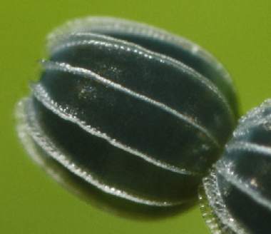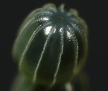 (参考) 卵の脱出跡 2011年5月21日 静岡市葵区中部 産 静岡市駿河区 飼育 保育社の生態図鑑に依れば、幼虫は卵の側面を食い破って出てくる、とあります。しかし見ているとそういう感じではなく、他のタテハチョウと同様に、天面を丸くくりぬいて、潜水艦のハッチを開けるように出てきます。他のタテハチョウと大きく異なるのは、そのハッチに上の卵列がくっついていることです。そのために、出てくるときに上の卵列が少し揺れます。ただし、出てくる側の側面は他の部分よりも少し多めに開けているようにも見えます。ここに示す写真は、脱出数時間後の、下から3番と4番の間の様子です。自然に折れ曲がっています。卵のすじが3本だけ残ってちょうつがいの役割を果たしていることが分かります。 トップページへ |