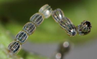 (参考) 孵化直後のサカハチチョウの幼虫(1齢、1.8mm) 2011年5月21日 静岡市葵区中部 産 静岡市駿河区 飼育 卵列から降りてくるときの様子です(上の連続写真(pdf)の最後です)。 トップページへ |