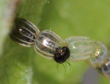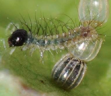 (参考) 脱皮直後の幼虫(3齢、5.0mm、コアカソ) 2011年5月25日 静岡市葵区中部 産 静岡市駿河区 飼育 どんどん成長します。脱皮直後の幼虫を観察できました。頭部は真っ白で、単眼や口の周りの構造がよく見えます。次第に真っ黒になります。 トップページへ |