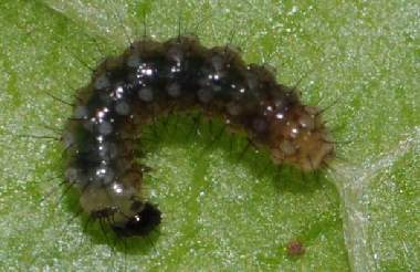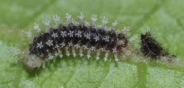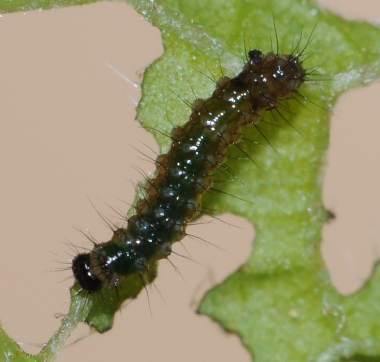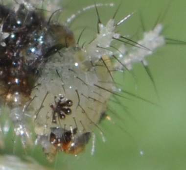 (参考) 成長した幼虫(2齢、5.5mm、コアカソ) 2011年5月24日 静岡市葵区中部 産 静岡市駿河区 飼育 2齢になると頭部に短い突起ができました。毛は、他のタテハチョウ類と同様に、分岐する棘のようになります。 トップページへ |